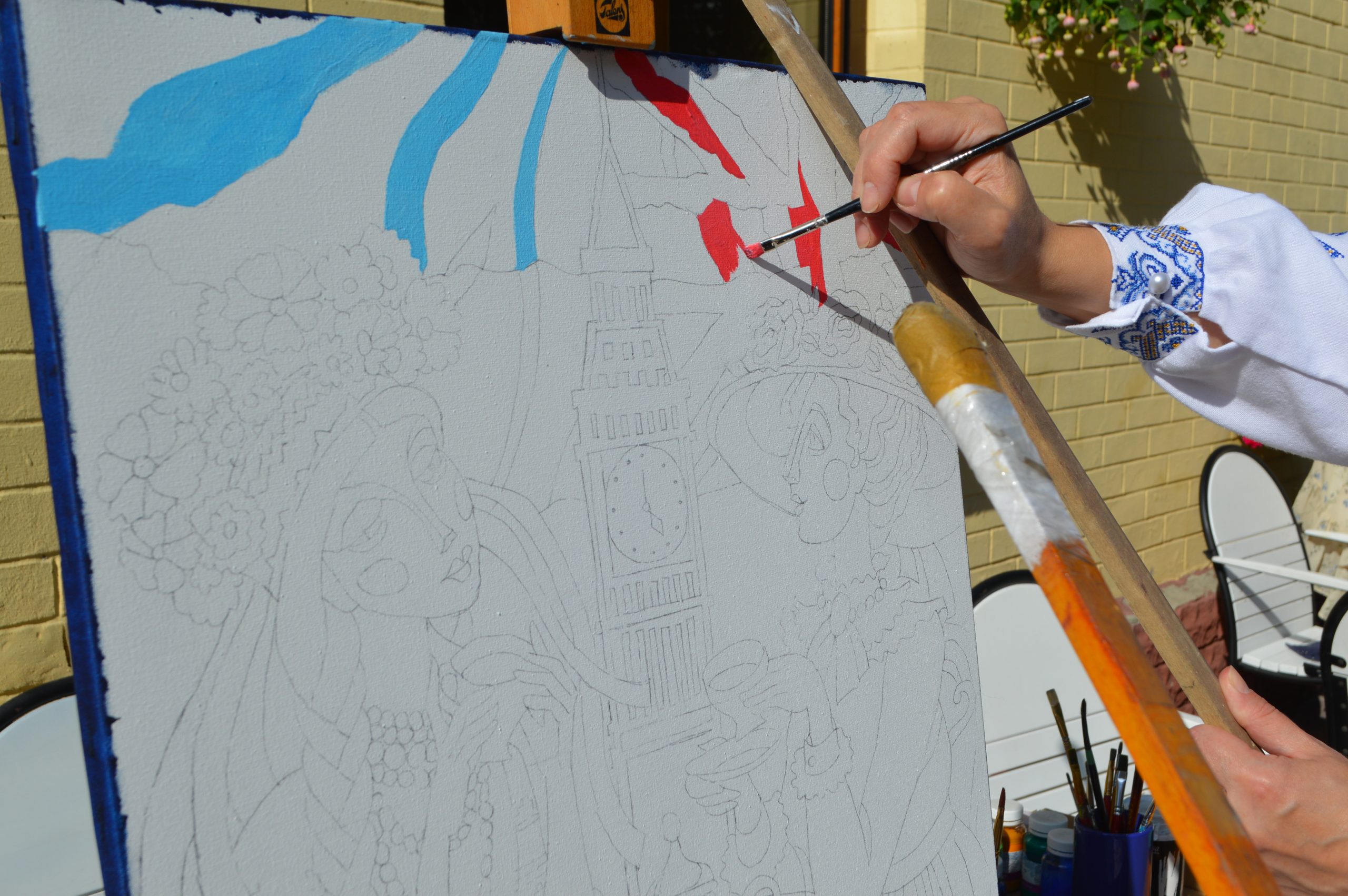 Колектив художньої школи під керівництвом директора Олени Цьомик готують малюнок. Пані Олена каже, що з великим задоволенням відгукнулась на пропозицію. Ідея виникла одразу – англійка та українка за чаюванням. Пізніше з’явився Біг-Бен і, зважаючи на «Файв-о-клок», годинник показує п’яту.